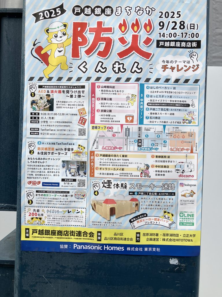 品川区の戸越銀座商店街で9月28日に「戸越銀座まちなか防災くんれん」が開催され、当研究室で開発した防災ボードゲームを出展しました。