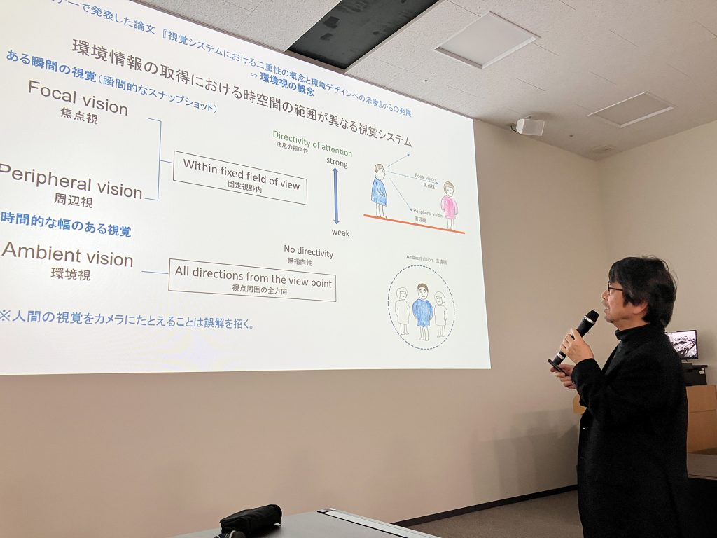 後半は大野先生から「ヒトコトとの出会いと研究遍歴」と題して、偶然EBSに出会った経緯や研究テーマの広がりについて、また先生の主要な研究成果の1つである環境視情報に関して詳しくお話いただきました。人との出会いが奇跡を起こすという言葉が印象的でした。